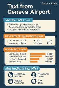 You can take a taxi, train, or private chauffeur service. For travellers seeking convenience, our Luxury chauffeur Geneva Switzerland option is ideal. Your chauffeur will meet you at arrivals, assist with luggage, and drive you directly to your hotel or meeting in under 20 minutes.